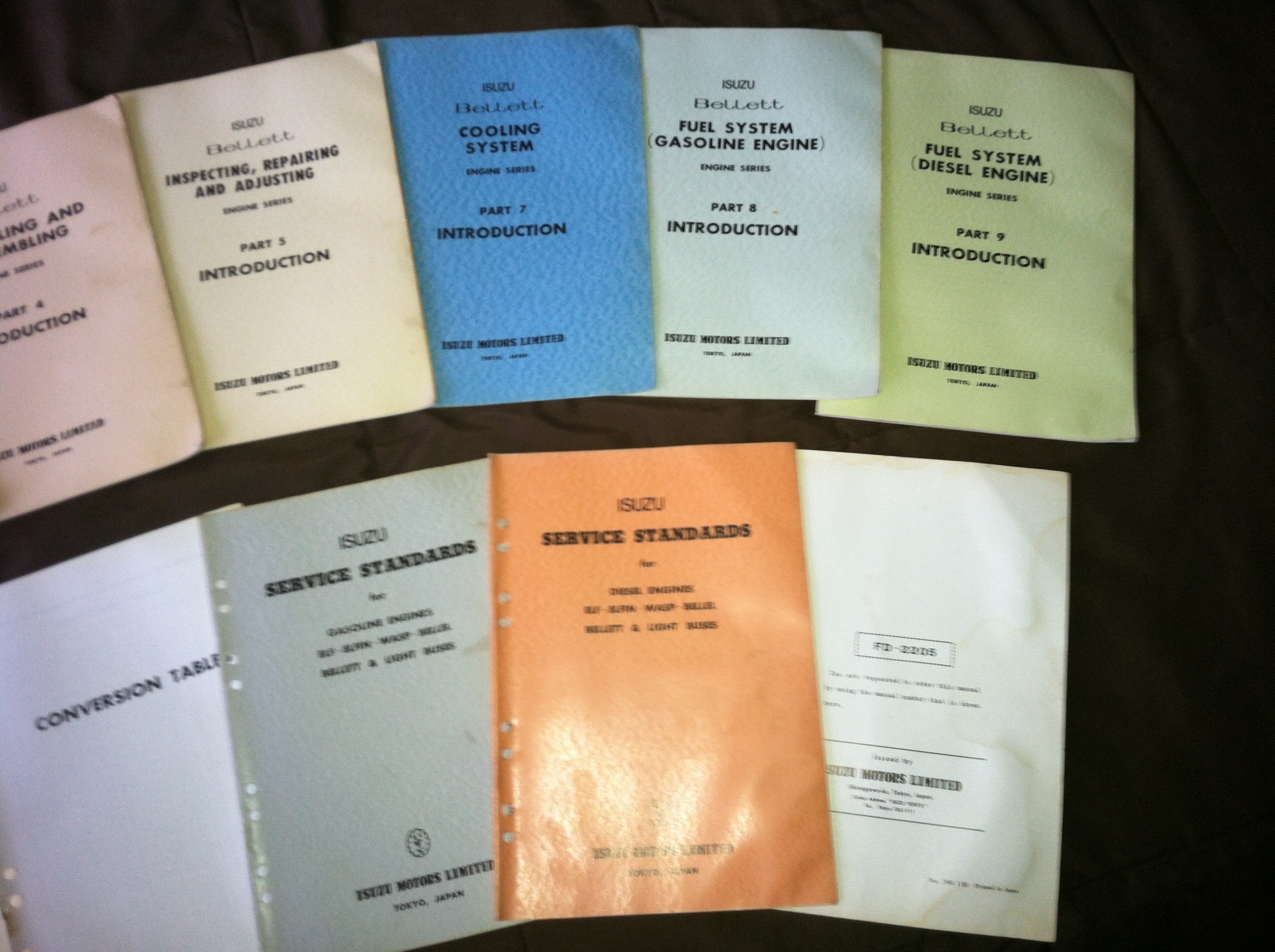 I am now the owner of an Isuzu bellett engine manual from 1965. I doubt it will be of any real use to me as both these are post 71 models. It seems pretty basic in the info it gives but i'd be happy to scan any sections for anyone that wants them. It is made up of SEVERAL smaller booklets, each detailing another system of the vehicle. I was excited to see the electrical manual as I know how important those can be. I've swapped enough japanese motors into US cars to know its a MUST HAVE.