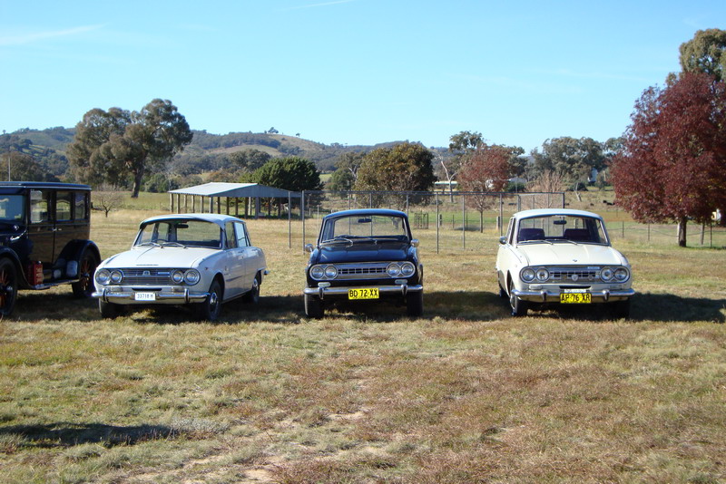 Ken - 'Doris' on the left (my '66 auto), Betty, & Gary Carter's '67 auto. Flag will fly in Gulgong this weekend!