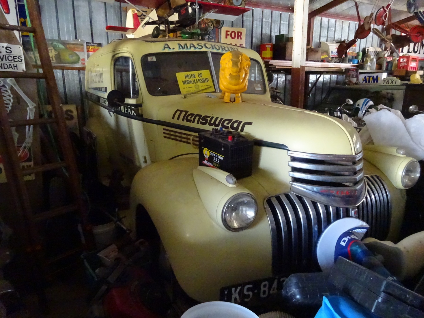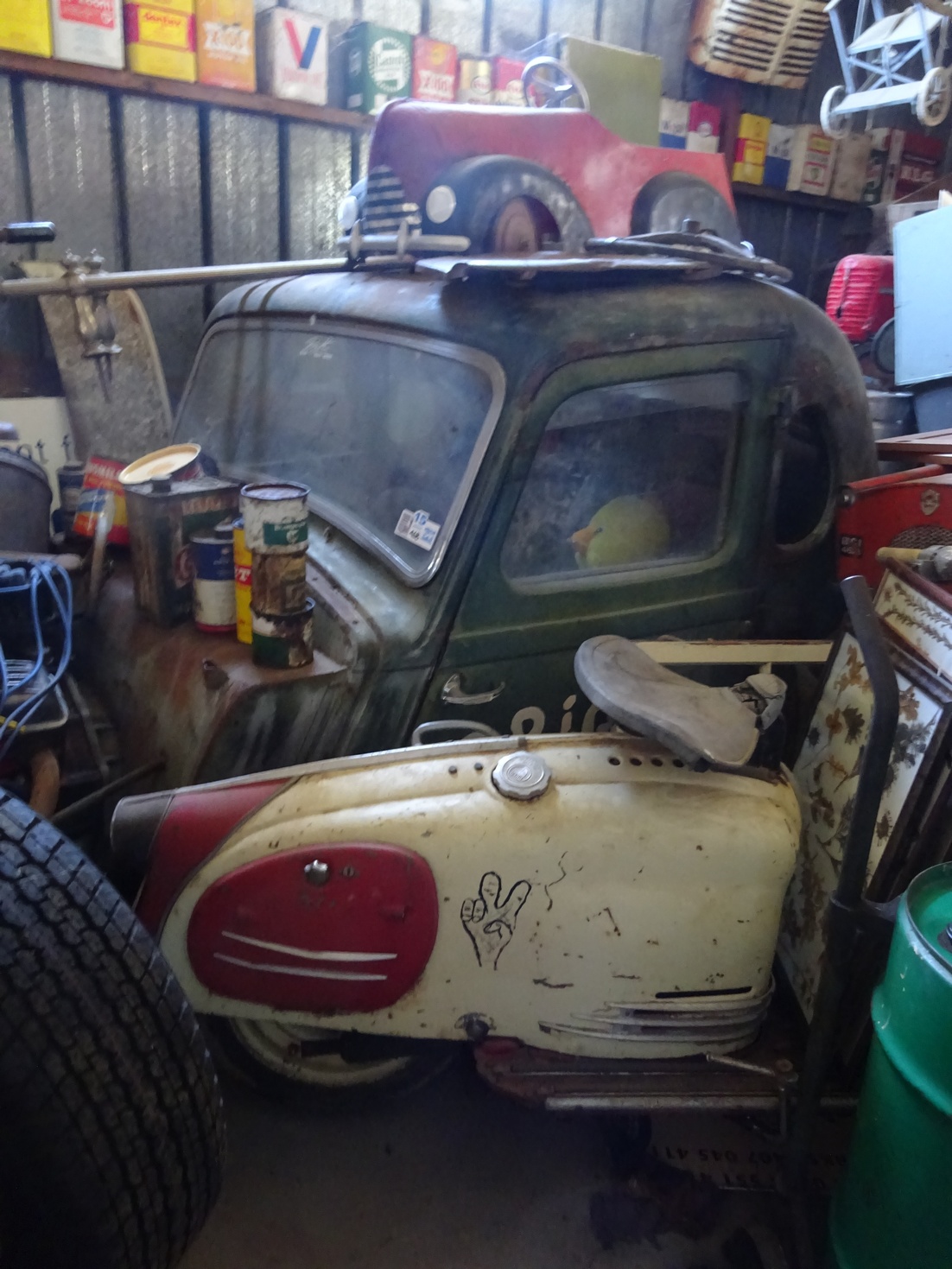 Then we started in the first shed...... you could barely move for the amount of gear he had in there, cars, bikes, vintage, hotrod, ratrods, toys, tins, signs, bowsers, bottles, legless mannequins...... It wasn't easy taking photos in there but here are a few that worked out ok Attachment: