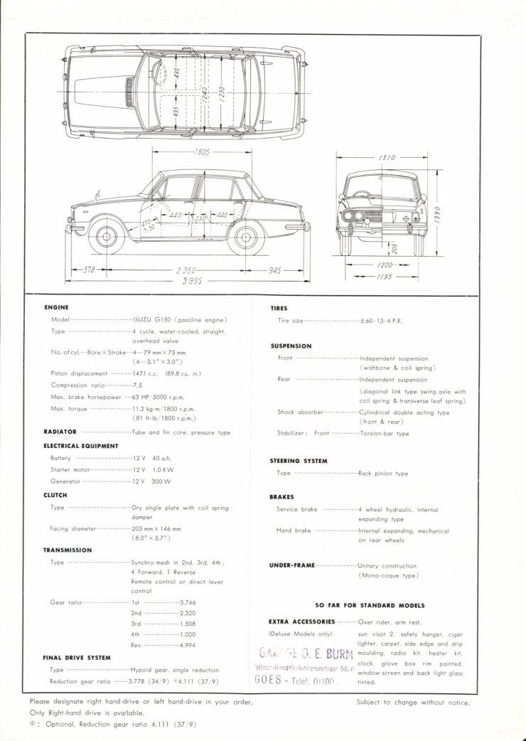 1964 Isuzu Bellett 1500 specification sheet - English language - single sheet, 2-sided - 02.jpg [ 96.25 KiB | Viewed 7100 times ]