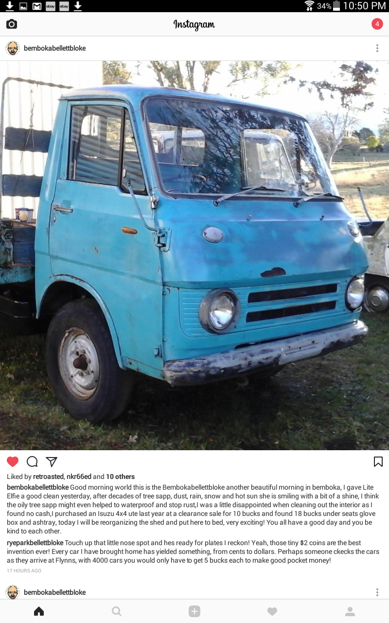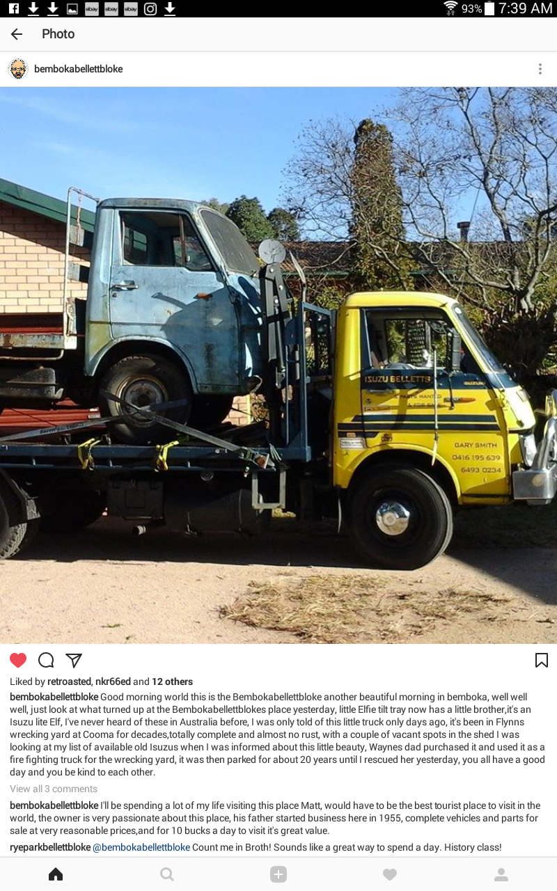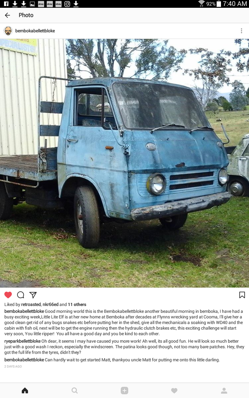 Ah, you blokes are good! Yep this Lite Elf was made from 1967 to 72. We haven't identified the year yet, but 67 or 68 looks likely. Its powered by a standard 1500 Bellett motor and column 4 speed. It has the spin on oil cap, so that suggests 67. Hmm, its a 1.25 tonner and would have to be heavier than a Bellett. Imagine it fully loaded, like a Bellett with a 1.5 tonne caravan on behind! It would do it easy! Neither of us have even seen one before, so amazing that this was sitting in Flynns wreckers in Cooma for decades. So close to Bemboka! And you are right Davo, its in Gary's shed!! From his instagram... Attachment: