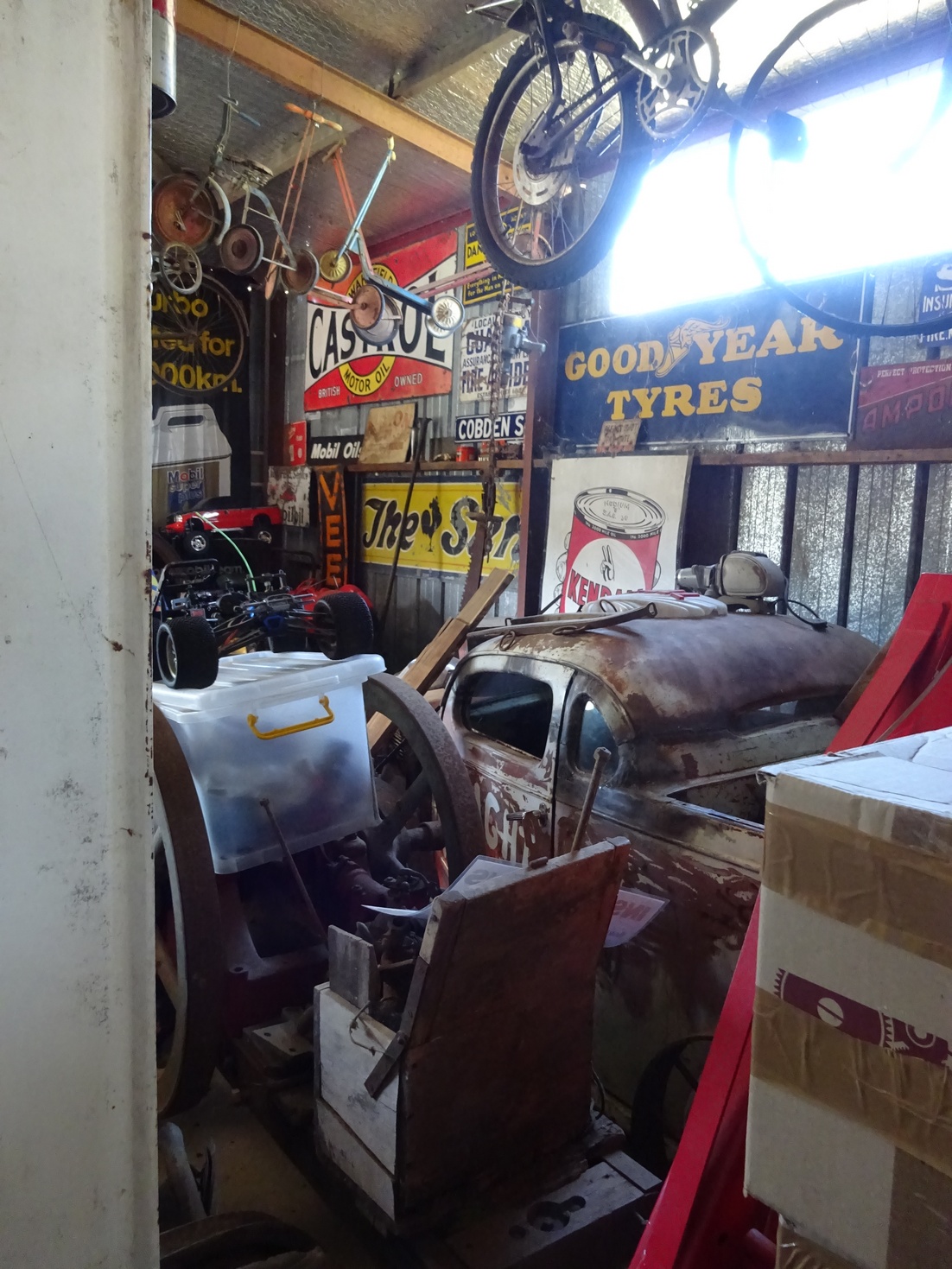 Then we started in the first shed...... you could barely move for the amount of gear he had in there, cars, bikes, vintage, hotrod, ratrods, toys, tins, signs, bowsers, bottles, legless mannequins...... It wasn't easy taking photos in there but here are a few that worked out ok Attachment:
