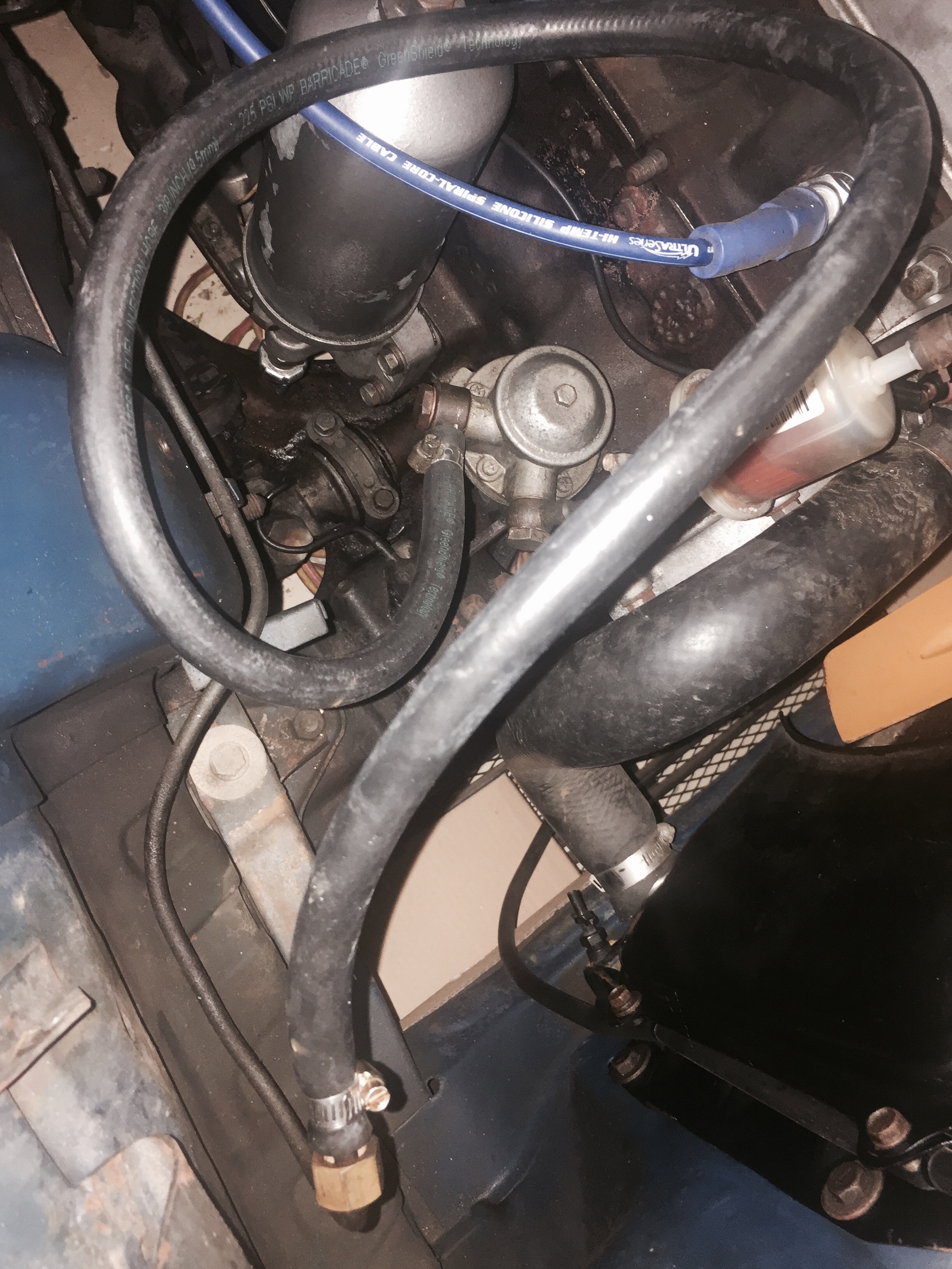 Hi Davo. Your configeration of the fuel hose is not correct. Normally the flter is before the pump. Not after as you have. The filter stops any grit getting into the valves in the pump and the carby. What you need is the steel line that goes from the pump, over the thermo. housing and to the carby. Use that filter that you have with shorter hoses. Not the "around the world" length that is there. You can carefully bend the fuel line coming from the tank to suit. Whatever happened to the original filter that you found a replacement element to go into from Supercheap.? If the fuel line that Lewis may be looking for is the 1 that you need and he cannot find. I may have 1 here to get you out of trouble.